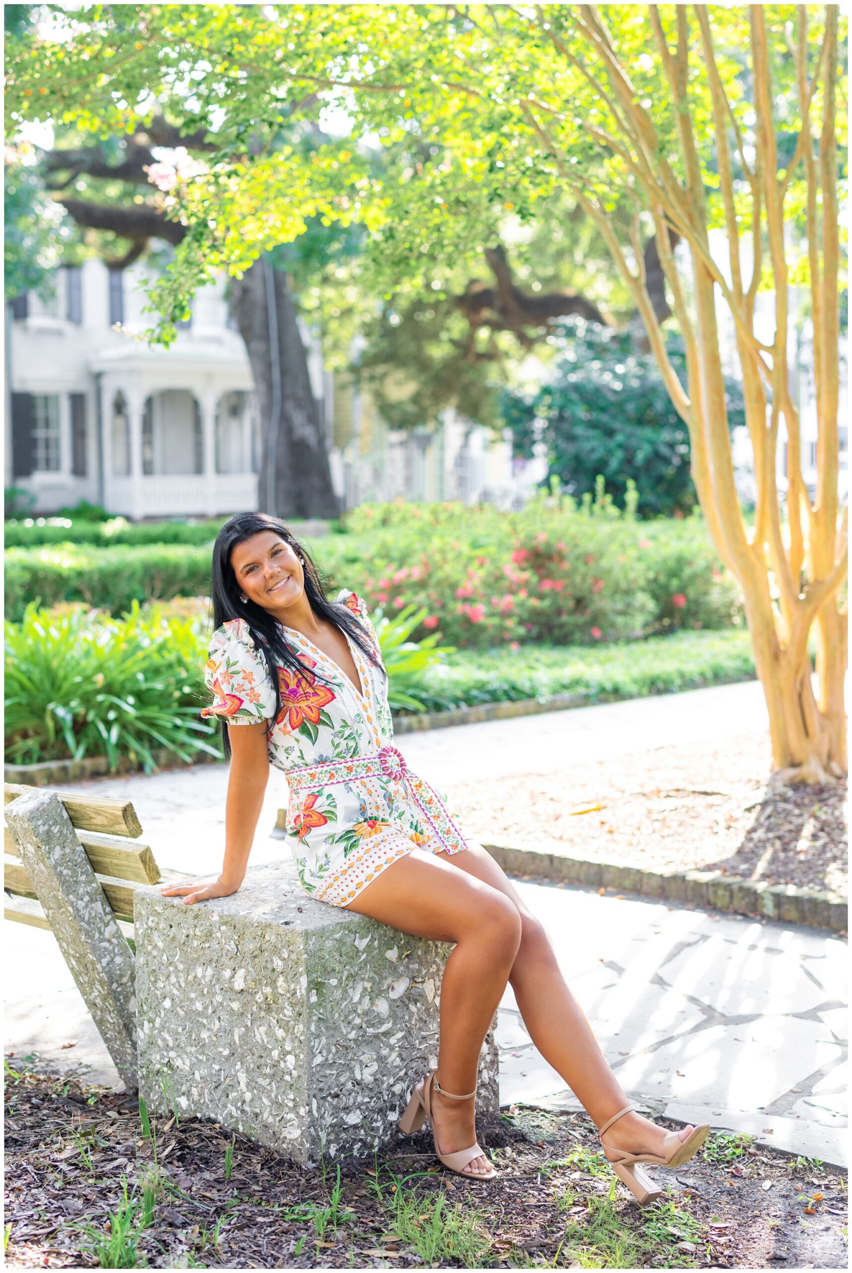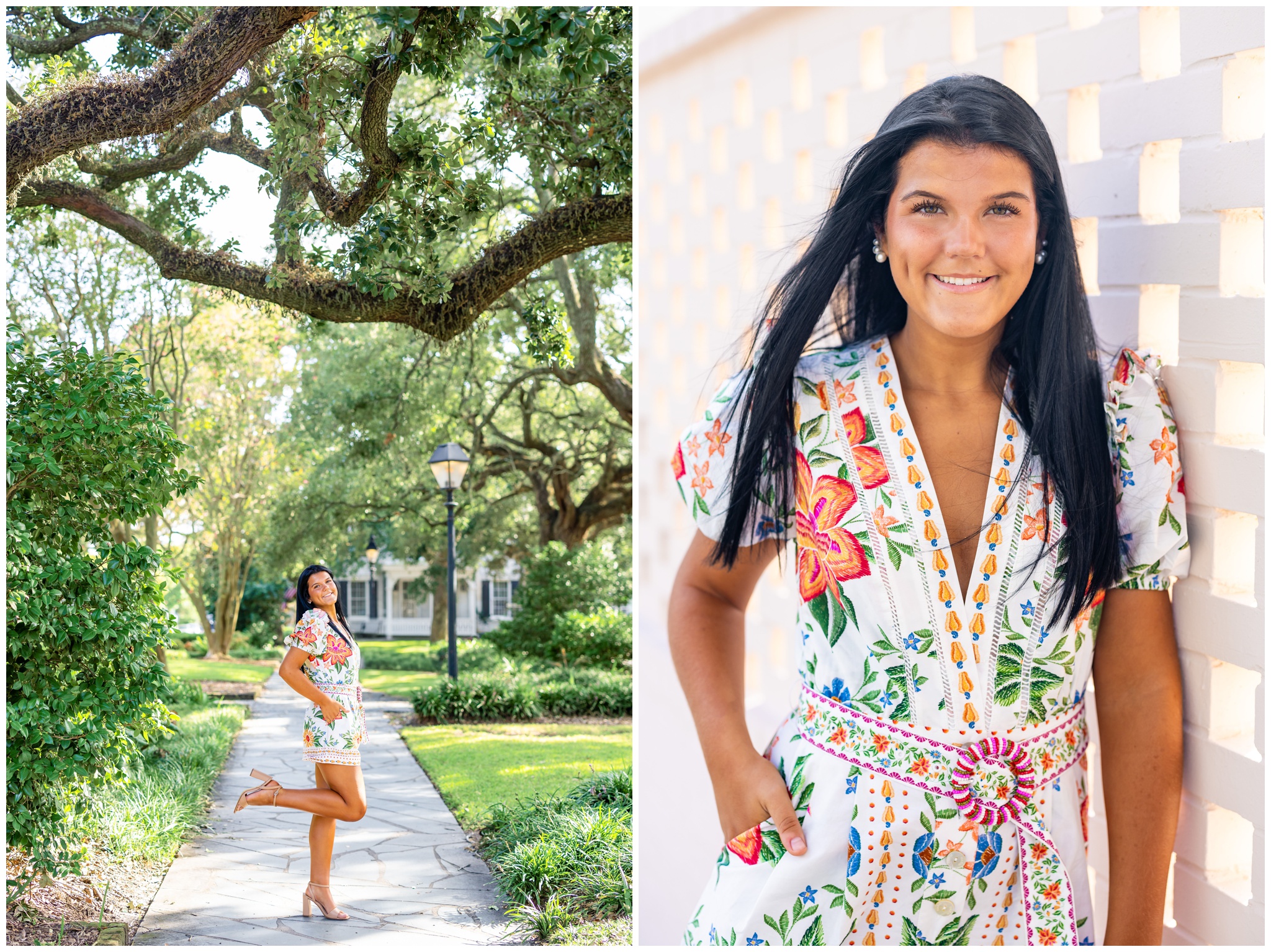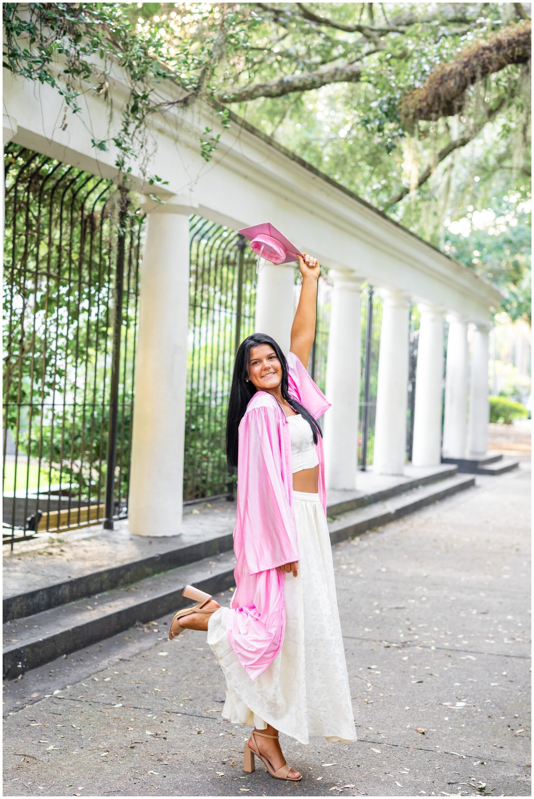 Sophie wanted to capture all of Savannah’s most iconic features: Spanish moss, gorgeous architecture and cobblestone streets. We explored two of my favorite squares downtown (Pulaski and Washington) before finishing up at Forsyth Park with her pink cap and gown (!!!) I hope the pink continues to be a trend these next few months because I am LOVING it!!! I have so many favorites – especially the colorful Farm Rio romper against the blush pink wall! Gorgeous!!