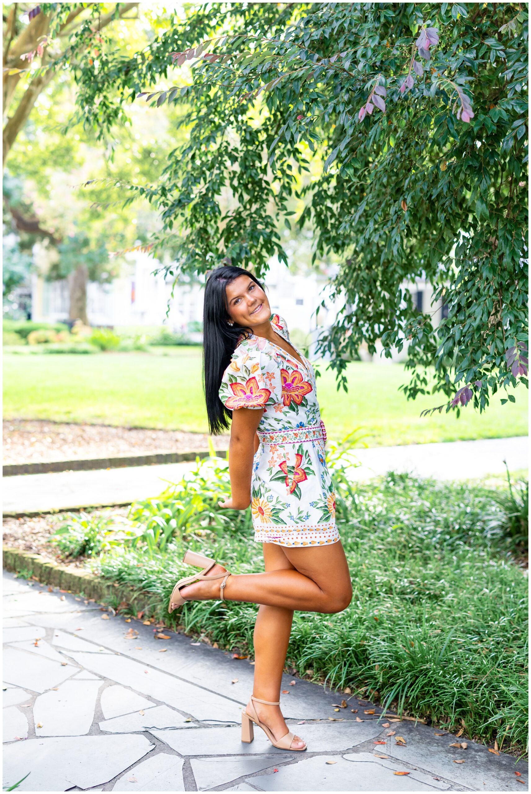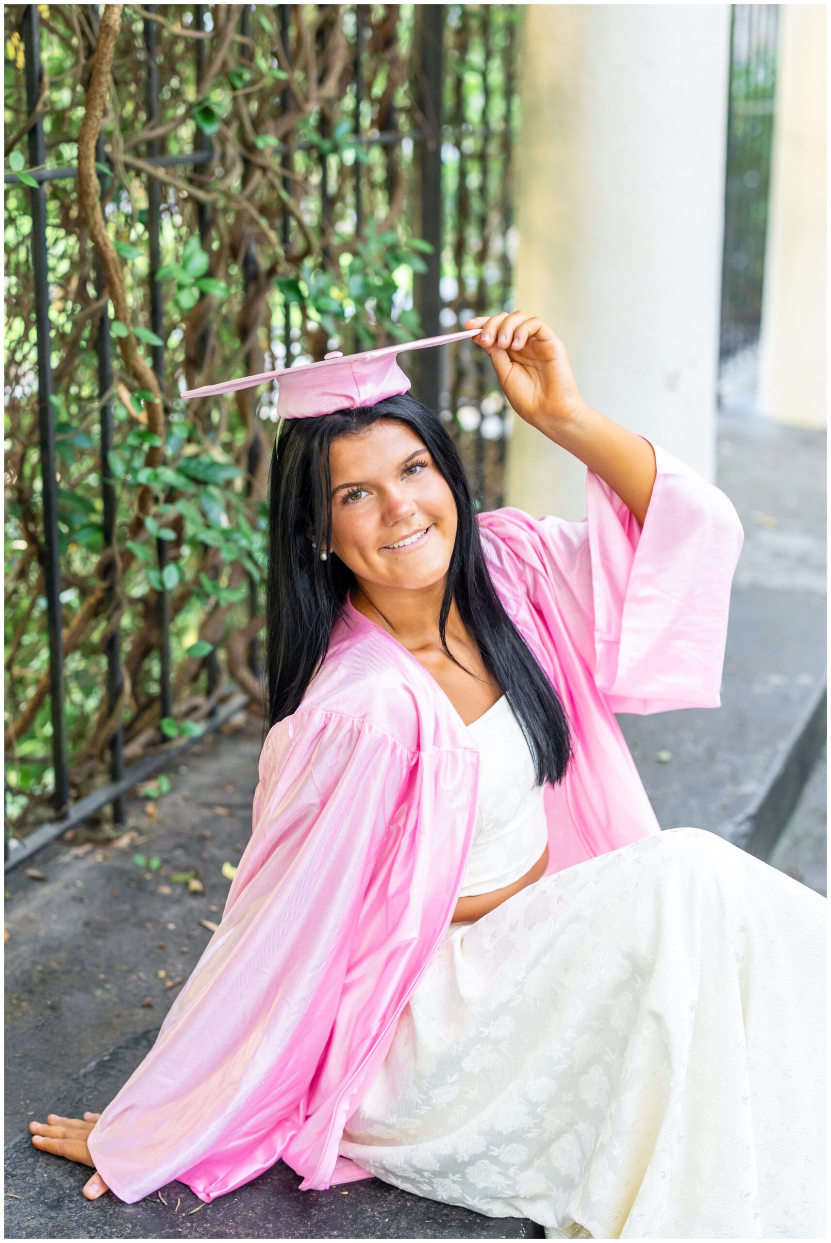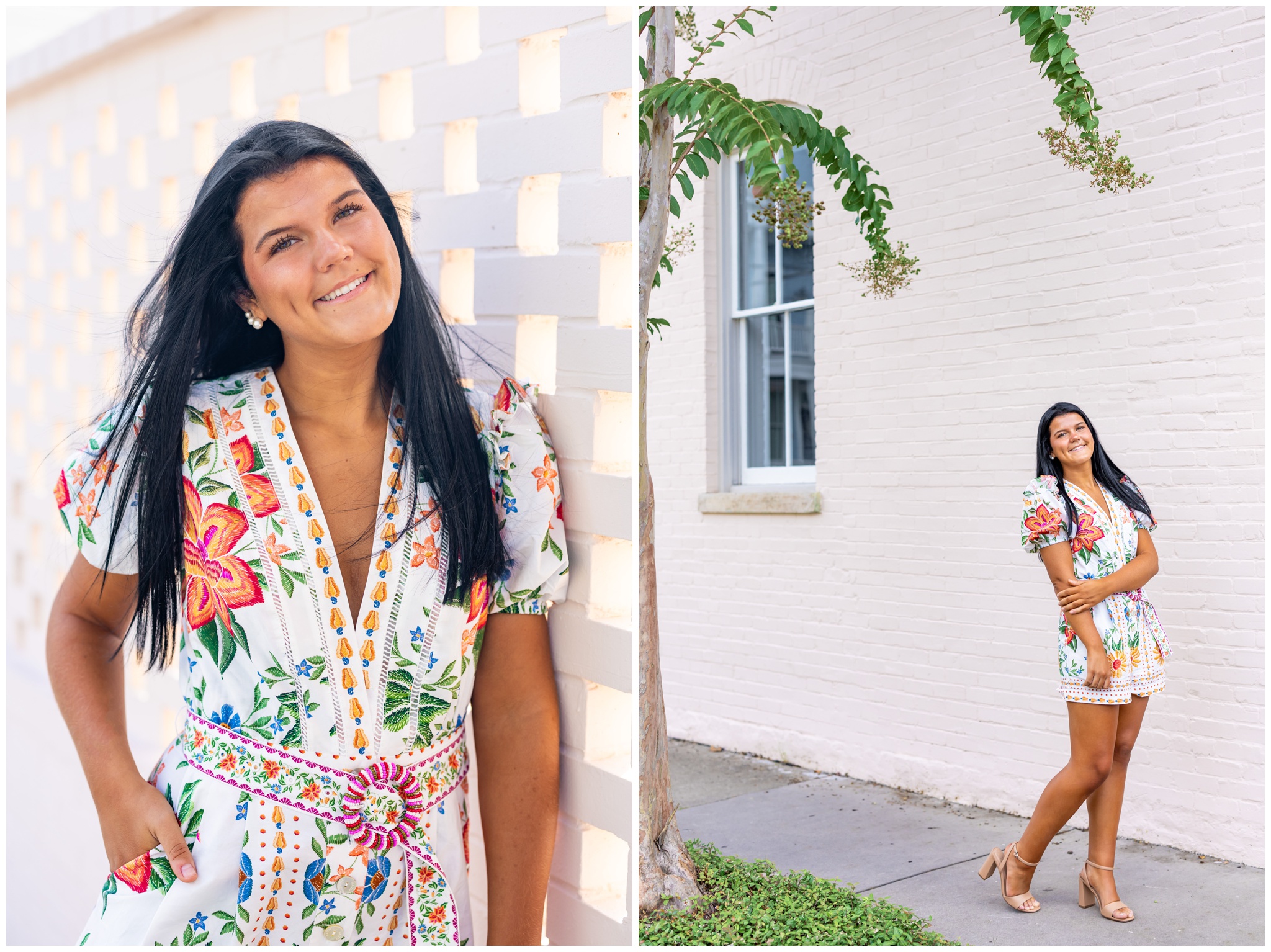 Sophie wanted to capture all of Savannah’s most iconic features: Spanish moss, gorgeous architecture and cobblestone streets. We explored two of my favorite squares downtown (Pulaski and Washington) before finishing up at Forsyth Park with her pink cap and gown (!!!) I hope the pink continues to be a trend these next few months because I am LOVING it!!! I have so many favorites – especially the colorful Farm Rio romper against the blush pink wall! Gorgeous!!